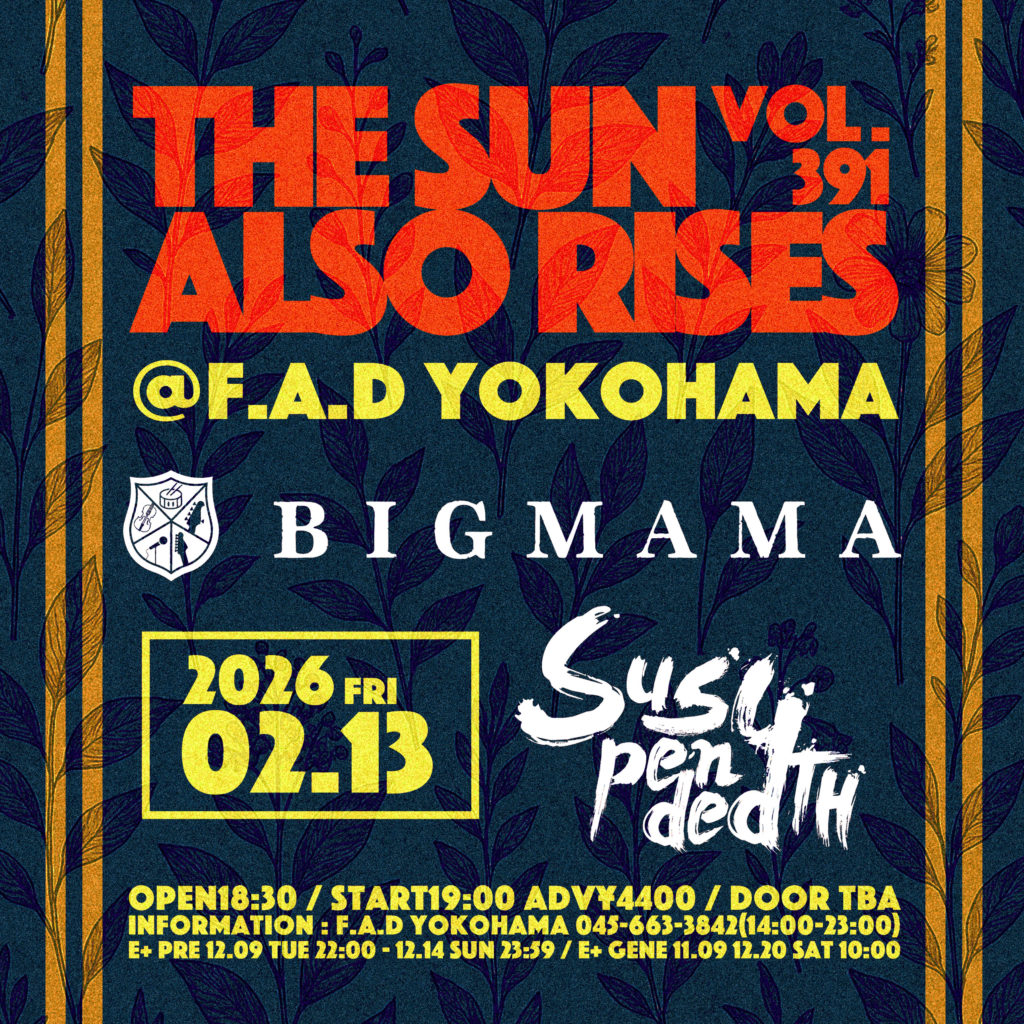 F.A.D YOKOHAMA presents「THE SUN ALSO RISES vol.391」へ出演が決まりましたSuspended 4thとのツーマン…