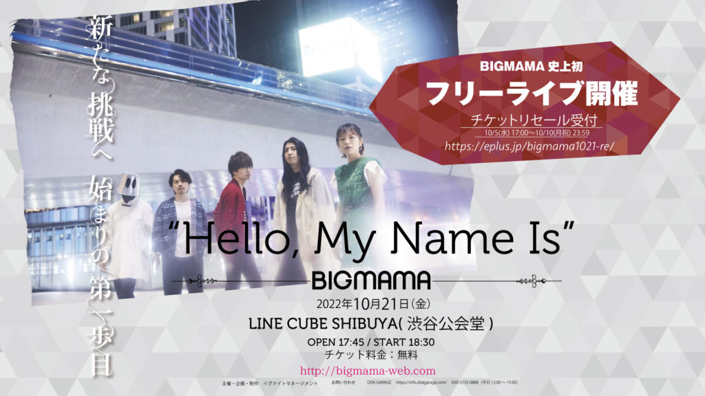 10/21(金) BIGMAMA 「Hello, My Name Is」@ LINE CUBE SHIBUYA公演におきまして、チケットリセール受付を実施いたし…