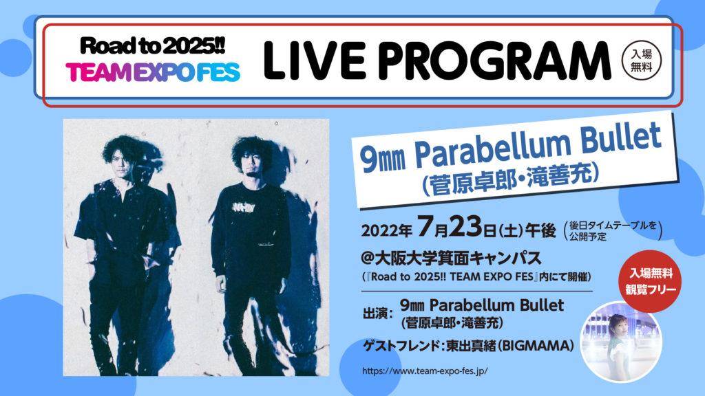7月23日(土)大阪・大阪大学箕面キャンパスで開催の『TEAM EXPO FES』16:45-9mm Parabellum Bullet(菅原卓郎&滝 善充)さ…
