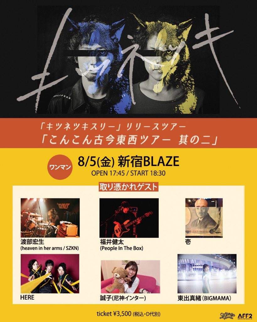 キツネツキ8月5日(金) 新宿BLAZE「キツネツキスリー」リリースツアー「こんこん古今東西ツアー 其の二」 【取り憑かれゲスト】渡部宏生(heaven in …