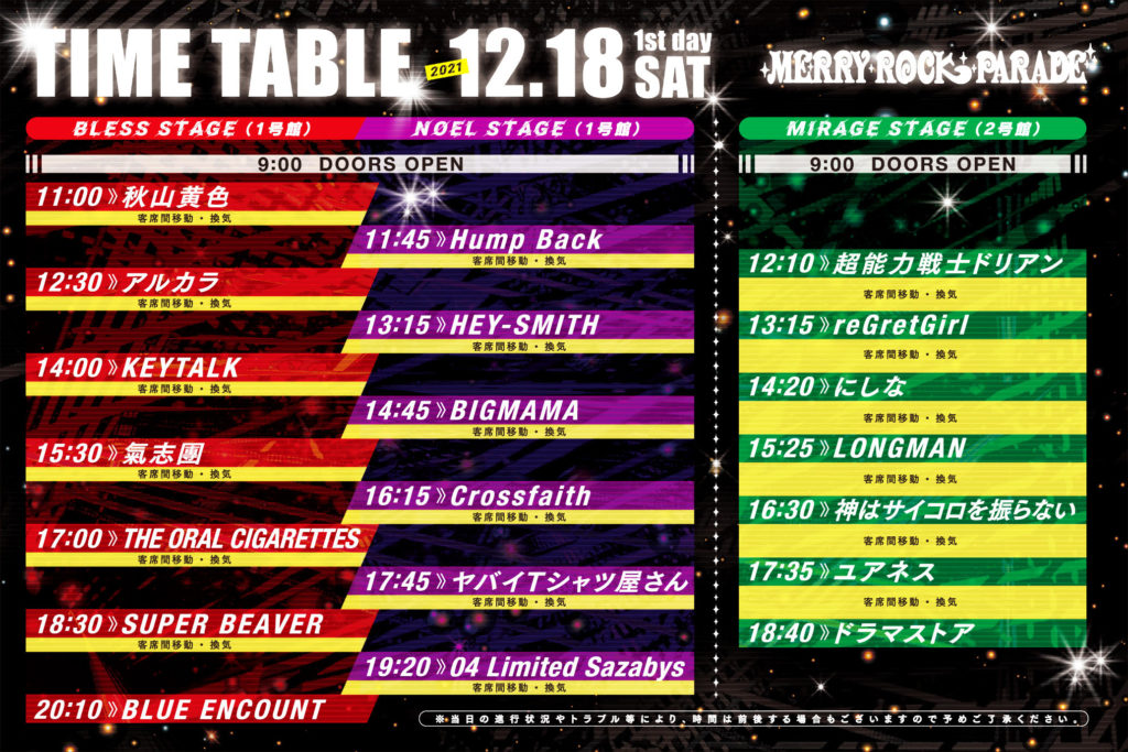 12/18(土),12/19(日) ポートメッセなごやにて開催の「MERRY ROCK PARADE 2021」タイムテーブルが発表となりました BIGMAMA…