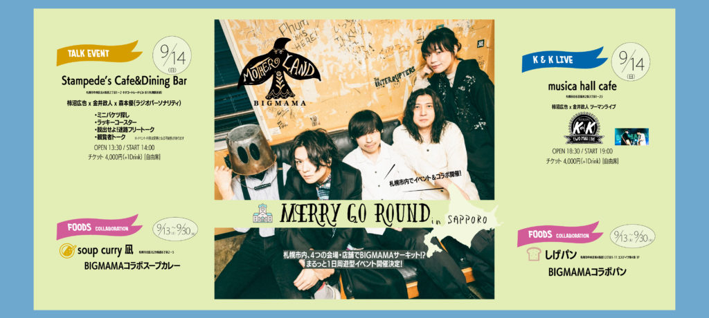 札幌市内、4つの会場・店舗でBIGMAMAサーキット!?まるっと1日周遊型イベント「MOTHERLAND~MERRY GO ROUND in SAPPORO~」…