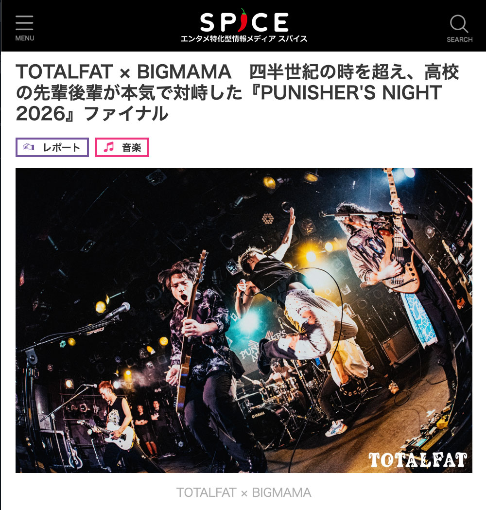 TOTALFAT Presents「PUNISHER’S NIGHT 2026」のライブレポートが掲載