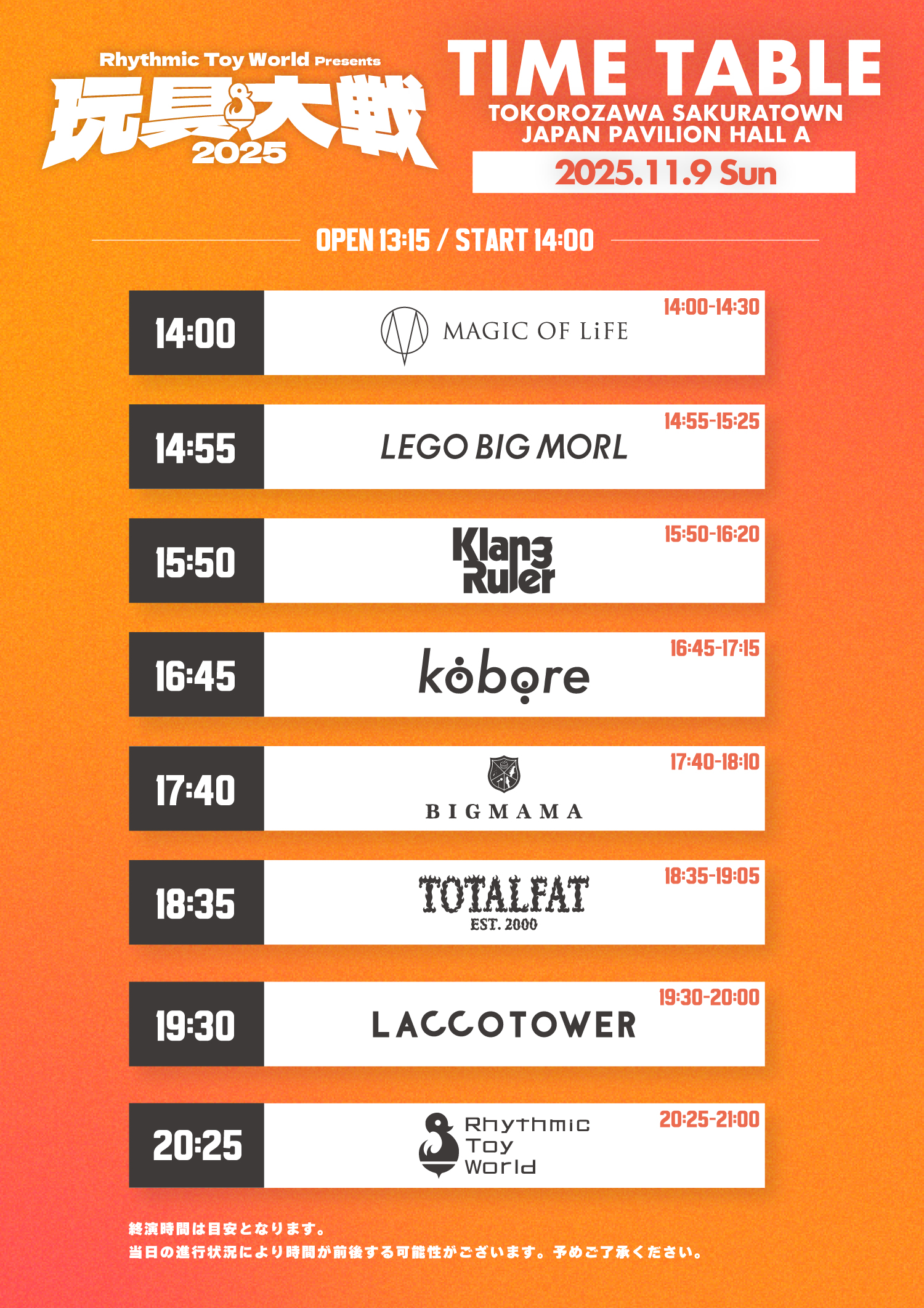 11月9日(日) ところざわサクラタウン ジャパンパビリオンホールAにて開催の Rhythmic Toy World Presents「玩具大戦2025」タイムテーブルが発表となりました