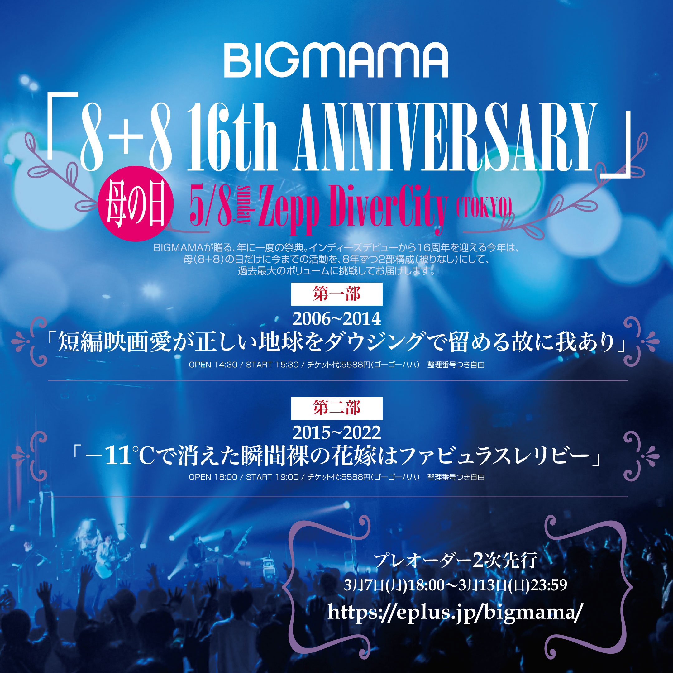 インディーズデビューから16周年を迎える今年は、Zepp DiverCity (TOKYO) にて母(8+8)の日だけに今までの活動を、8年ずつ2部構成(曲被りなし)